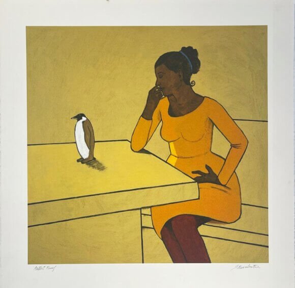 Title: Woman in Orange dress with Penguin – Artist Proof