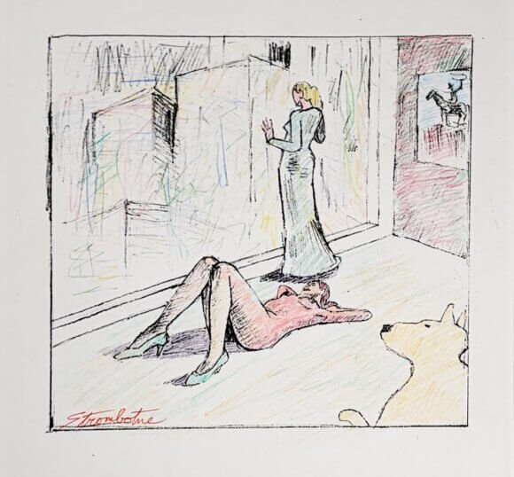 Title: Pink lady on Floor, Green standing, yellow dog